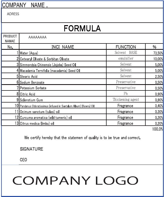 | 成分の机上判定料金20100116~ | お客様が交渉からもらう書類は3つあります 1フォーミュラ 2製造工程表 3試験成績判定表(ANALYSIS SHEET)です。 フォーミュラとは フォーミュラとは、成分名・比率・配合目的・製品名・会社名・責任者・日付・サインか 印鑑のある証明書のことです。 成分が、はじめから分かっていれば、不要な検査を排除して必要な検査だけを行います。 闇雲に検査するよりも検査を絞れるのでコスト安になります。 化粧品会社では、原料を1から製造するのではなく、車同様いくつかの成分を混ぜた原料を 使うのが一般的です。 原料にもフォーミュラがあります。 成分名に原料の名前を書いてはいけません。これが書けない工場は、 失格と言っていいです。 アジアではよくあることです。弊社から指導します。 製造時ではなく完成時の分量にしますが国によっては製造時の分量が、 かかれてくる場合があります。それはそれでしょうがない話です。 エタノールや水など蒸発してしまうものは 限りなく0として考えます。キャリアの成分も書くように指導がありますが 一番降順あたりに記載します。 ![]() サインは、マネージャーでもOK 2製造工程表 は簡易でもOK 3試験成績判定表(ANALYSIS SHEET)は工場によって、また国によって違います。 日本で参考になるかどうかは分かりません。これは秘密が多く公開されないものです。 |