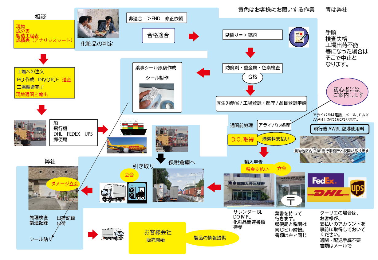 | クーリエ DHL FRDEX UPS 工場・問屋発送の梱包→インボイス・パッキングリスト・場合によってはMSDSシートを用意 クーリエの選択 → 運送会社の担当が荷物を引き取る。→ 輸出通関はクーリエが行う。 → 飛行機に乗せる → 日本到着 成田 函館 大阪 那覇等 → 郵便局 通関の担当から連絡が来る。 → クーリエの通関作業 → 通関し許可をもらう → 税金・事務手数料をお客様が払う。 税金支払いは事前にアカウントを取得してください。 無き場合は弊社経由で課金となります。 → 弊社に来る → 貨物を弊社倉庫に搬入 → 輸入作業はここまで → 化粧品検品判定出荷作業へ |