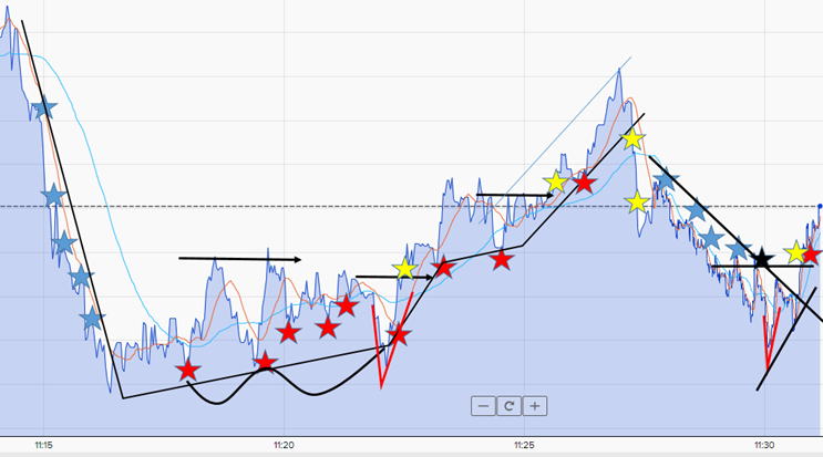 市場は人が動かしています。個人トレーダーだけではなく、大口 中口 の方々も参加している エリオット波動のようにジグザグの時もあるが、階段状になることが多い エリオット波動なら、12345波であるも、ばらつきがあります。 スラッジの時はエリオット波動は摘要できませんので やりのような動きは、参考になりませんので5秒から10秒位待ってください。 ラインは書いていませんが、目測で描いてください。 大きくもない、小さくもない動きのうねりこそチャンス 最初の動きの❶では、連続性があるとは言えないので ここでは、❷で15秒エントリー ❷の後もチャンスだ。 続いて➌でもエントリー 解説がないならここはギャンブルと言われても仕方ない この間30秒 これ以降はエントリーしないで20-30秒様子を見ます 動きの波形も観察し、❶❷の波形と違うなら、パスしてもいい 本来なら➌ではエントリーしないが、順行に戻ったので即エントリー 15秒エントリーの世界では、2秒の遅れが命取りだと 崖相場は一気にドカンが来る時ですが 今までの経験でその2.分前に兆候が表れます。 ドカンの後は、反発があるので坂道エッジがでるまで待ち エッジが出ればどんどんエントリーしてください。 このトレンドの終わりは、ラインブレイクですが、30秒すぎてエントリーすると 確定前に反転しまって負けることが良くあります。昇龍拳の時もあります。ブレ スラッジとか 30秒過ぎたら、エントリーせず、次はどうするのか考えます。 もし30秒過ぎて順行すれば、次の1分の00秒以降エッジでエントリーしていきます。 トレンドの反転はブレイクで即エントリーではいけません。 そこらでは売り買いが逆転するので、あきらめきれない人やいや、もう反転だという取引があり 前回の高値 前回の安値を更新するまで待つか ![]() または、水平線を引いてブレイクを待ちましょう。横滑りが長引きこともあるので。 大きいくさびがあれば、反発すると思った方が良い。ヒゲであるので |