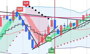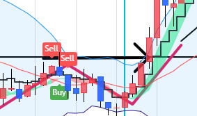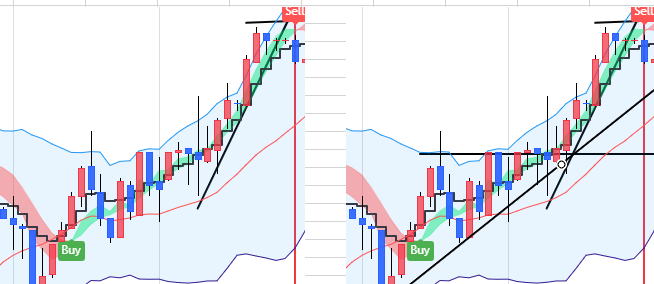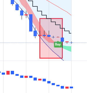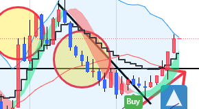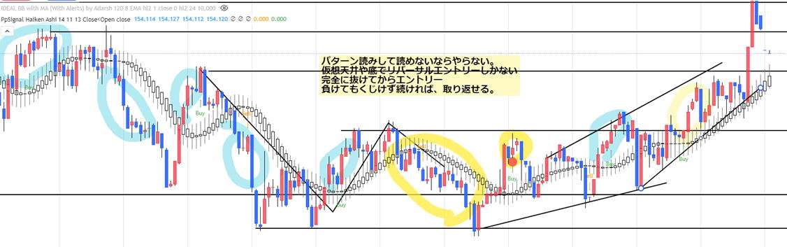 エントリー 解説 いくつかあるトレード手法の1つです。考え方を理解すれば役に立ちます。 階段線の下にロウソクが近づいてきたらここから戦闘態勢 ⓪最初に5分足でトレンドラインを引き、方向性を見ます 分からない時もあります。三角相場やレンジです。 1分チャートに変更します 反発してトレンドラインのブレイクがないならやめます。 ブレイクが条件 これはトレンドに逆らってエントリーしないための確認。 階段の向きが大事で、この向きをトレンドの方向として判断します。 今後この階段の傾斜があればエントリーチャンス。 戻りは、放棄します。負けてもOK ❶階段ラインの下にあった陰線 ❷陽線がきた。まだ分からない もしかして反転の第一本目かまた下がればトレンド継続と2通り考える ICBM地下で点火 ➌トレンドラインブレイクで階段線をクロス 勢いを感じる この辺で目線は、HighLowチャートも観察 エントリーは我慢 ICBMブーストし地上へ ❹バンドの色がかわるので、階段線を完全に抜いたので、即エントリーします。1分3分エントリー 00秒でエントリーもOKです。 こうなるって予測しておくことが大事。基本はここです。ここでは完全なエッジが出ています。 ![]() 気づいたらなるべき早くエントリーした方が良い ❺ここでもエントリー可能です。3回目のエントリーなら00秒でエントリー1分 でエントリーしてください。 上ひげは押し目になるので、そこか、押し目明けになった瞬間を狙うとなります あくまでエッジがあるとしてです。 ❻❼これは書かなかったが1分エントリー ❽最後は思いっきり負けます。ラインブレイクで負けたら一旦中止しましょう ★★ どんな場合での良いかっていうとそうでもないです。 勝てそうな相場っていうのは流れにパターンが出る時です。 たくさん参加者が増えると、流れが追随し行っての流れになります。 有利な時間帯があります。朝 夕 晩です。 昼 昼過ぎ 深夜は適していないので負けに行くようなもんです。 |