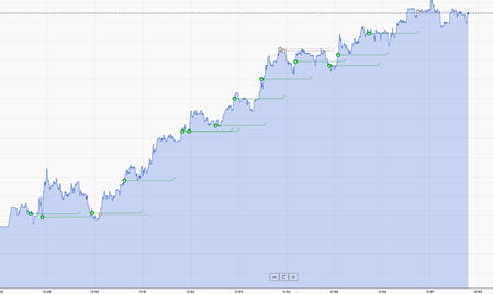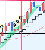 | 利食いの陰線が出ると階段線に近づきますが 流れができれば❻❼を起点で順行します。 ❽でエントリーします 2回目以降のエントリーは00秒の1分エントリーをお薦めします。 HighLowチャートに慣れてエッジの方が正確だと感じる方はエッジエントリーしてください。 |