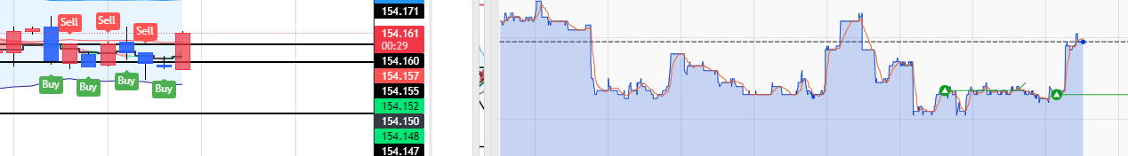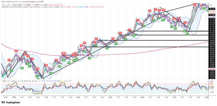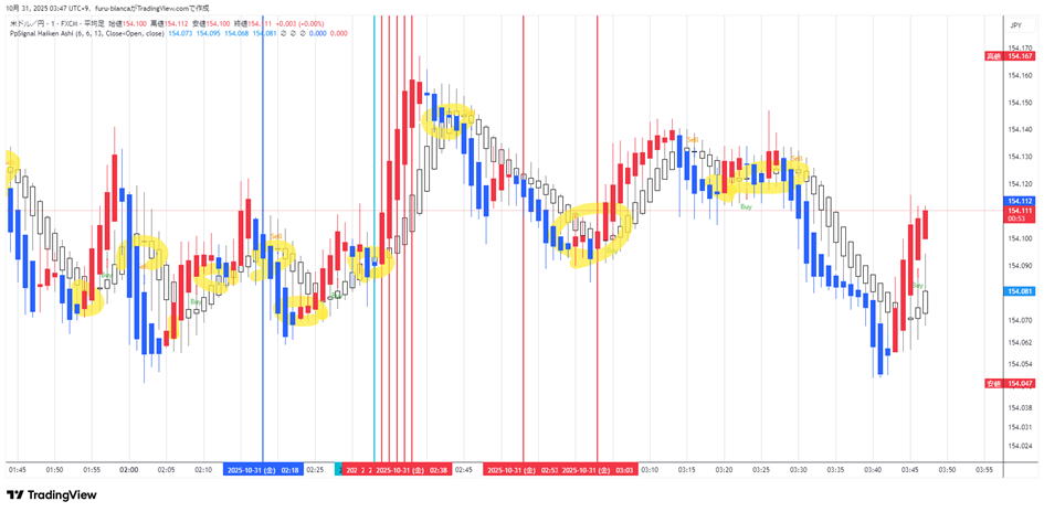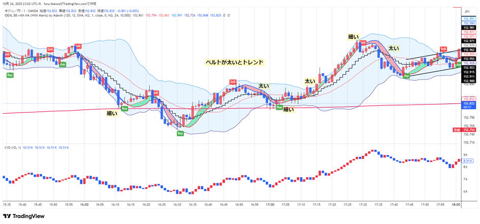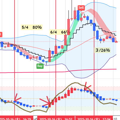 平均足打法 平均足も使うと良いのですが、最後が使い物にならないので注意してください。 実際のエントリーはエッジというよりトレンド方向とその毎分エントリーです。 実際のロウソクと平均足のロウソクを常にみくらべます。HighLowチャートはそんなに見ません。 ★孕み、駒、十字線、色変化があればエントリーは終了します。 エントリー 基本は平均足の色が変われってそのろうそくがほぼ確定したらエントリーします、次にロウソクを00秒でエントリーもOK 実際にはいきなり色が変わることもあり、最強ですが、孕みになって次に信号が出ます。もたつく時もあります。 普通サイズのロウソクがベストです。駒。十字、せんべいはパス 絶対じゃないのはレンジになったり、4本レンジなら平均化がちぐはぐになってダメです。やればやるほど負けます。 ここも3分で毎回エントリーした方が、一本陰線おもらし(利食い)を吸収するので勝率が上がります。 どんどん進んで、孕みや十字 駒ななったら狙うだけで、見てるだけ。 また色がはっきり変わり普通サイズの平均足ロウソクでエントリーします。トレンドが復活することもあります。 20251017 22:48-58 ![]() 平均足のRSI併用しよう Heikin Ashi RSI Oscillatorを使えば平均足のRSIも使えます。 とりあえず最後の3本を狙わないないなら、検証ではほぼ3分エントリー出全勝に近い。 ずっとやっても80%は維持します。自分で確かめてください。時々スランプもあるんですが・・・ 平均足のRSIの線を見てもできます。角度が変わったら3分エントリーします。 極論細かいロウソクの動きなんか見ません。線の向きが変わってロウソクの色が変わったらさらに優位になったので 3分エントリー1分エントリー または3分の連打します。連打は5分 ![]() 後は上記と同じです。 |