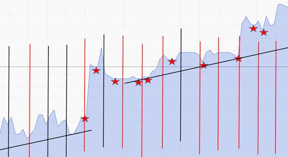 | 階段・ベルトトレード 連続性がないとバイナリは順張りでは勝てません。その考え方はたくさんあります。 全体のチャートを見て、あるトレンドが勢いに乗った時こそロウソクに連続性があり、最大のバイナリやFXのエントリーポイントだと考えました。 勢いにリズムが出た時が最高のエントリーポイントです。 勢いが出ないとどんなエントリー方法も成功しません。エントリーして突然いい方向に行けば、ヤッターと勝を確信するでしょう。たまに大戻りもあるんですが・・・ 勢いがある場所とは、20MAブレイクした時やその前からだと観察から知りえました。 これは奥が深いが最後は単純化してみたいと思います。 この20MAも併せて、より使い勝手が良いのが、DEAL BB with MA (With Alerts)の階段ラインとしています。 反転の売り買いの攻防が落ち着いて、方向性が出てきたときがより優位だと考えたエントリー手法です。 階段ライン、20MAラインをブレイクしていけば、連続ロウソクやそれからトレンドができやすい傾向があります。 一回のクラスタトレンドは、ロウソクが8-9本です。最初に反転、それから少し行って、最初の押し目がでてそれから順行、このあたりが連続ロウソクがでて勝ちやすい。 クラスタトレンドの中間手前あたりを順張りで狙う手法です。 パターン チャート次第でパターンが毎回違うのでエントリー前に、片道・全戻しの時間を解析してエントリー時間を決めます。ここでは3分が基本です。 反転時もチャンスですが、これはこれで後から記事にします。 反転がV字になればほとんど勝てますが。なればの話です。確実に反転かどうかは、オンタイムでは、なかなか確信が持てません。 あああレンジで負けちゃったとなることも多いもんです。トレンドラインブレイクや最終ろうそくを抜けたらとするか、5分エントリーっていうのも良いアイディアかも知れません。 どのように対処したら勝率を上げられるかです。 トレンドライン技法は、ここでも使います。トレンドの反転ブレイクをしたかしないかの目のひとつにします。 これはめんどくさいと思うなら、トレンドラインの代わりに階段線を目安にして利用します。 ロウソクが上なら上昇 戻り下降ならパス ロウソクが下なら下降 戻り上昇ならパス ロウソクと交差なら迷いで保留 |