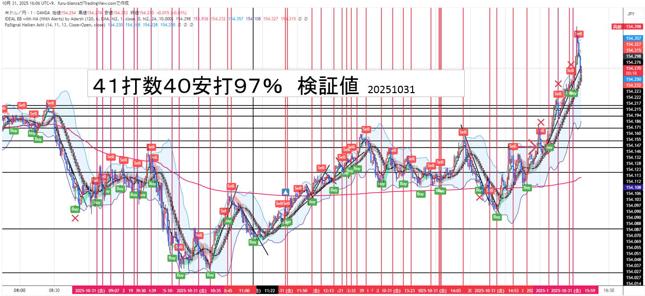IDEAL BB with MA (With Alerts)の90%超のシグナルトレード20251031昼間 トレビューを使っていますが、有料で見てください。無料だとデータが遅れますので1分では無理があります。あくまでここは検証であり実際は20%くらいのロスになります。 パラメーター2nd lenchを6にするだけ 20251031のもので検証したら97%これはほぼ全勝 皆さんもどうぞやってみてください。 ![]() 調子に乗って逆方向エントリーも含まれました。すみません。でも勝ってしまっています。 サイン通りに次のロウソクで1分 大底なら1分3分でエントリー ほんの少しなら遅れたって大丈夫です。 サインがどのタイミングで出るのか見極めてからエントリーを検討してください。 シグナルはロウソクが確定するまで出たり消えたり出たりします。 ルール1:トレンドラインを引いてインフィールドのトレンド方向トギャクナルシグナルは無視します。 Xシルシの部分 勝てるかも知れませんがトレンドを無視してはいけません。 多分平均線3本ならパーフェクトオーダーの時は順行トレード一択 ![]() トレンドの逆のエントリーmpロウソクがうまくうねっていれば勝てますが、本日たまたまです。 下はトレンドが真横だが適当にうねっているところです。バイナリをやるには最低7本のロウソクが適当と感じています。 こんな場所時は1分エントリー一回にしてください。 ![]() 20251031 16:59 7シグナルの次をエントリーしたら6勝でした すごいの一言。![]() けっこう当たります。 ルール2:エントリー時間は、基本1分 1分と3分の併用は前回のロウソクが10本程度あればです。 トレンドと同じ方向であれば1分3分同時エントリー 慣れればですが 慣れないなら2連打 ルール3:反復はバンドウォークが短い時は、1分か30秒エントリー ルール4:ゼブラトレンド 赤青が交互に出る場所は信号が出ないと思いますが万一でても無視してください。 信号が出るまで待ちくたびれます。 そこで 信号はその場だけじゃなく、それ以後の目線を教えてくれるので、トレンドに乗れれば乗ります。 どこでやってもいいというわけではありません。 ![]() 左側なら一分でエントリーすれば7連勝一敗ですが右側は2勝一敗後、エントリーに困ります。手を出せば負けます。 ちょっと感の良い人なら3分エントリーで押し目を吸収して乗り越えるでしょう。 ダウ理論んお世話様です。水平線ならブレイクで二回エントリーできます。根拠の切り口は知っていた方が良い。 もしトレンドならうねりもあります。チャネルの端っこタッチエントリーするか、陽線陰線を追随するエントリーかは様子を見て決めてください。 簡単なエントリー根拠でトレンドラインブレイク ❶トレンドラインブレイク むずいのは、二本目をしとめることです。一本目でブレイクって分かったらブレイクだって行っていないで即反転エントリー 最終ろうそくを抜けるのが基本ですが、続くかどうかは分かりませんがトレンドと同じ方向なら連続性が高くなります。 ❷水平線ブレイク 王道です。 パーフェクトオーダー めったに出ませんが、レンジの後によく出ます。短いレンジはトレンドの中腹にまるで休みのように見えますが出来高が増えますと ![]() 売り買いが激しくバトルし、その後方向性のあるトレンドになるもんです。 トレンドラインを自由に引いてみましょう。決まりはないです。ただ2点の接点は効いてるって感じがします。 覚えておくと良いのはゼブラトレンドです。ここでみんなこの泥沼にまっちゃうんです。 ![]() どっちも同じチャートですが左は、何気なく上がって見えて、右はは中腹でレンジ形成。ここで陽線で1分エントリーしたら死にます。 ➌N型И型は水平線と同じ N Nの反対のИ![]() これはなかなか、気づかないもんです。けっこう鉄板です。80%は行けます。 W底M天井などのロウソクのトリックやその他いろいろあります。お任せします。何かあれば教えてください。 FXでも使えます。 FXなら損切ラインは信号の場所にして決めておけば、多少バタつきがあっても見ていればいいだけです。 仮にBUYサインならHighエントリーしてSELLサインで決済でいいです。 ドカンがないことを祈ります。 寄り道しました。すみません |